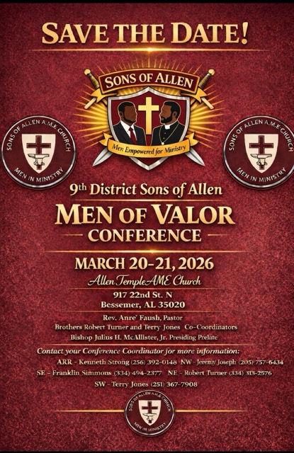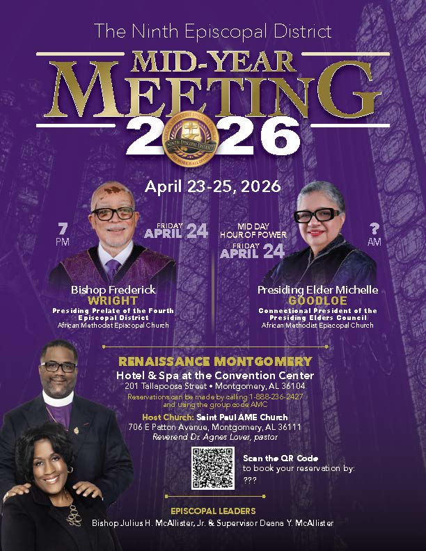 Welcome to the official website of the Ninth Episcopal District of the African Methodist Episcopal Church serving the great State of Alabama! It is my honor and sacred duty to serve as shepherd over this dynamic community of approximately 250 AME churches, united in our commitment to advancing God’s Kingdom. Here, you will find a wealth of resources, spiritual guidance, and updates on our collective ministry efforts, all designed to equip and inspire as we labor together in the vineyard. This digital space is a testament to our shared vision of excellence, unity, and faithfulness. I pray that as you navigate this site, you will be encouraged, empowered, and reminded of the profound calling we share—to bring glory to God, serve His people, and impact lives for generations to come. May this platform strengthen our fellowship and serve as a beacon of light and hope to all. Welcome, and God bless you richly!